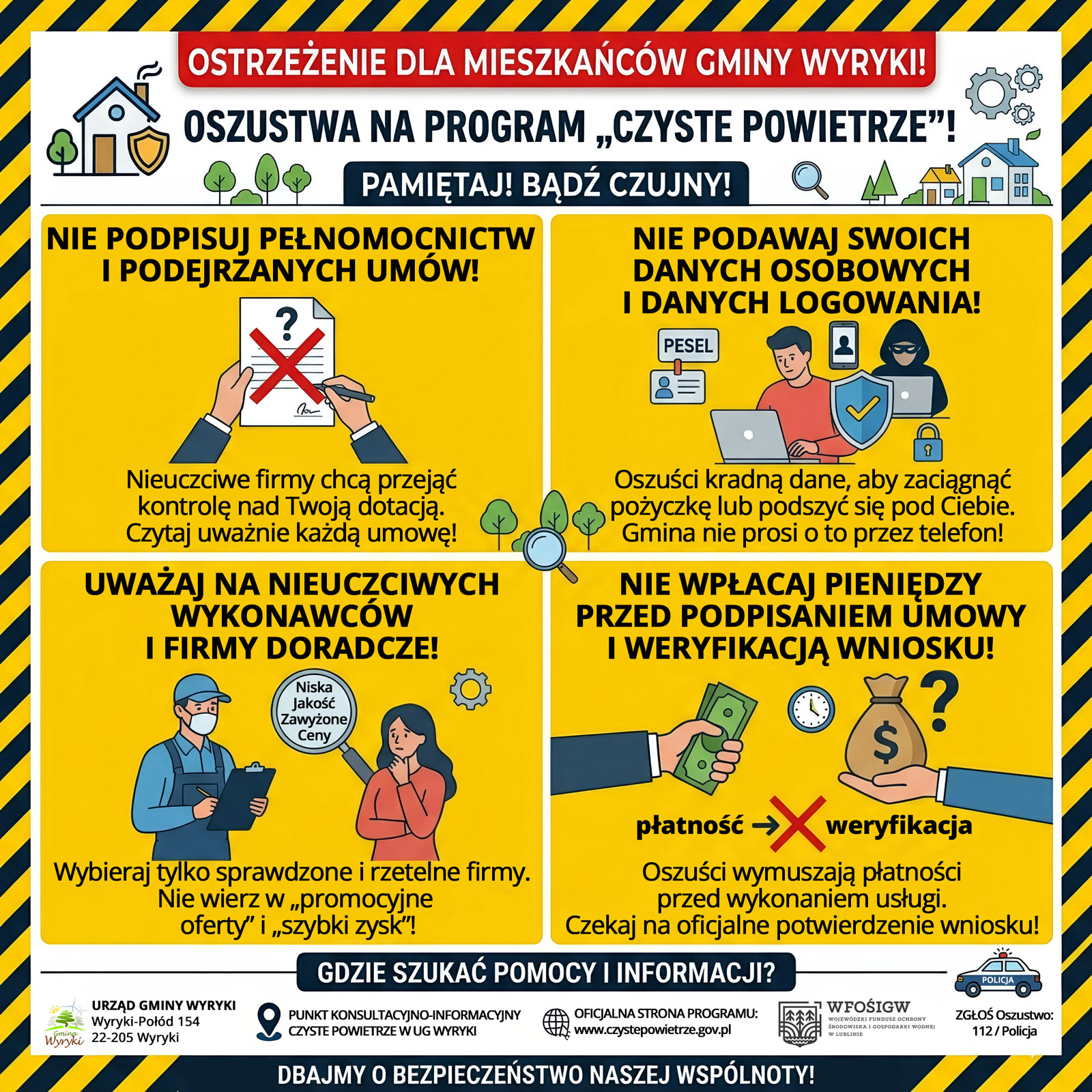 Do Urzędu Gminy w Wyrykach docierają w ostatnim czasie bardzo niepokojące sygnały. Odnotowaliśmy zgłoszenia o osobach podających się za przedstawicieli firm zachęcających do udziału w programu „Czyste Powietrze”