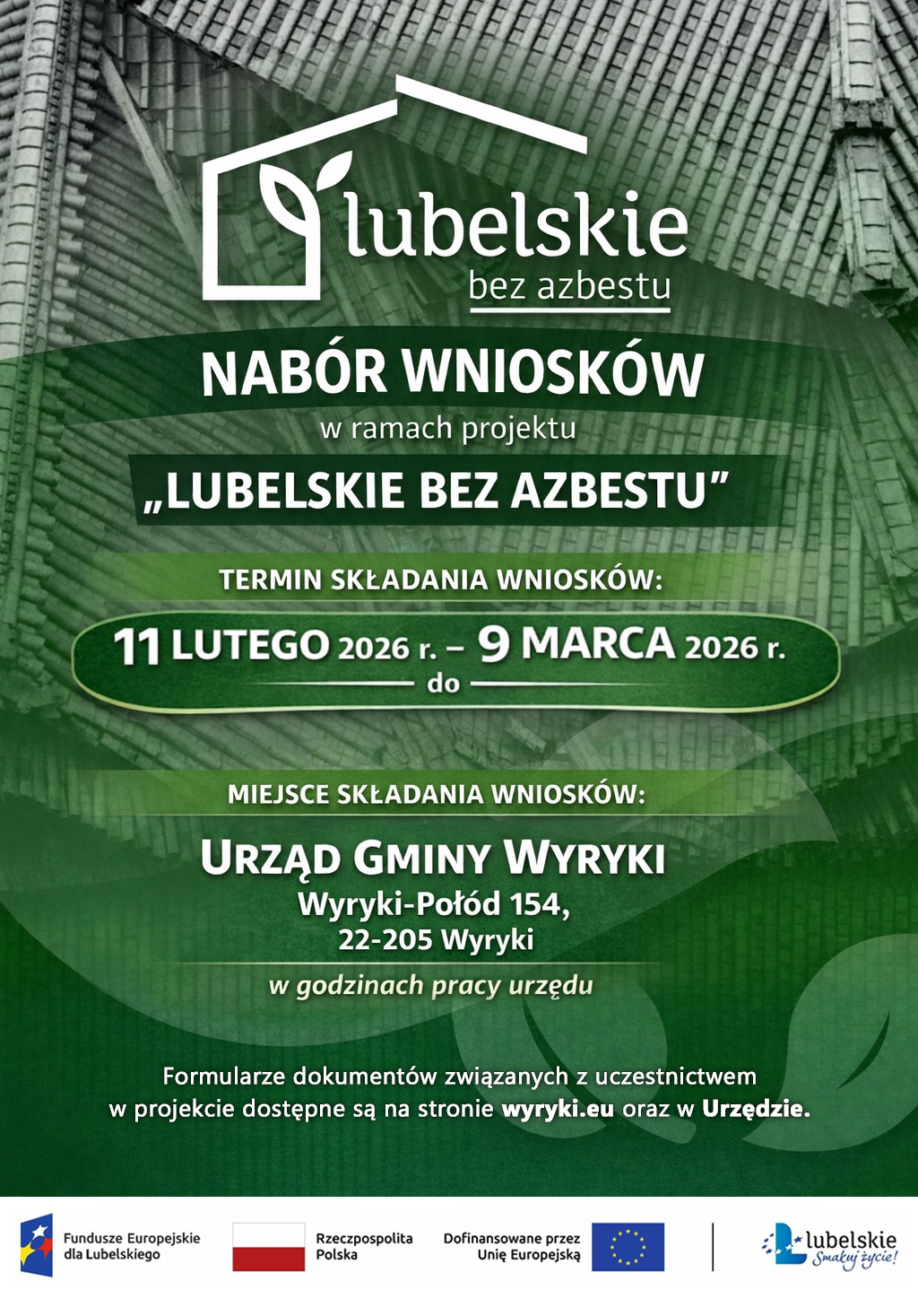 Jednocześnie informujemy, że ustalono nowy, wydłużony termin naboru wniosków do projektu „Lubelskie bez azbestu”. Nabór prowadzony jest od 11 lutego do 9 marca 2026 r. i dotyczy wyłącznie wniosków złożonych na aktualnych formularzach, zgodnych z obowiązującym regulaminem.